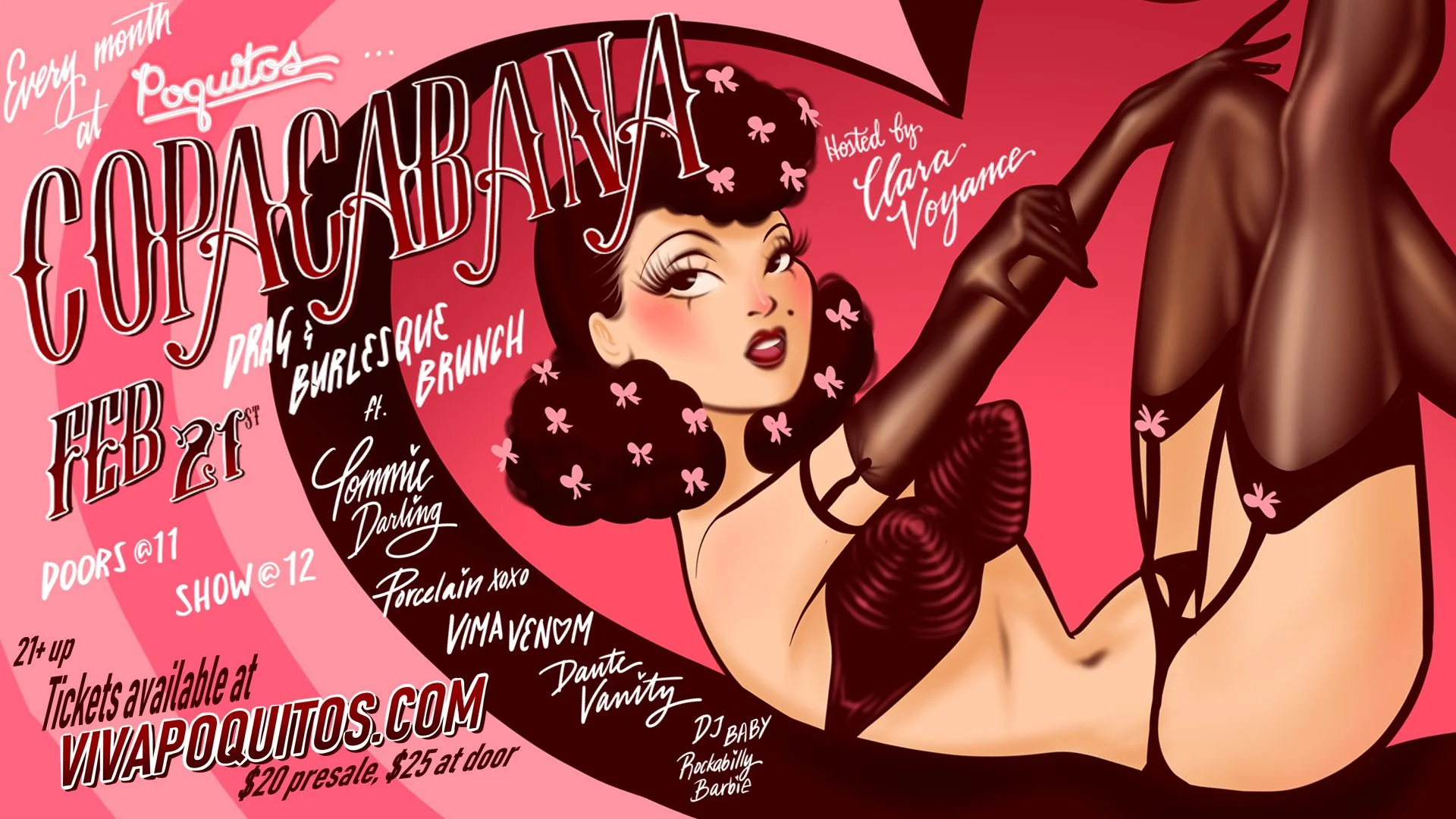 Join us at Poquitos on Saturday, February 21st for an afternoon of unapologetic glamour hosted by the incomparable Clara Voyance, alongside our resident diva Tommie Darling and show-stopping performances by Porcelain, Vima Venom, and Dante Vanity.